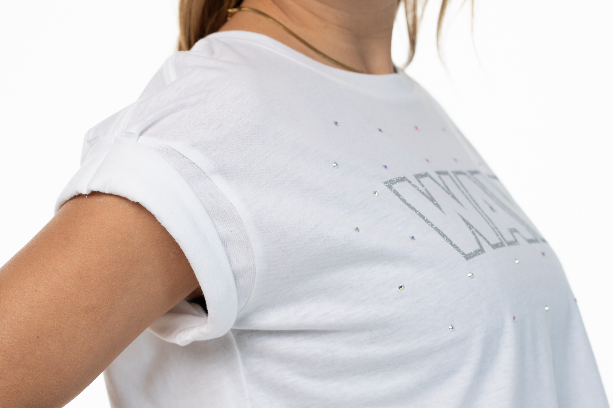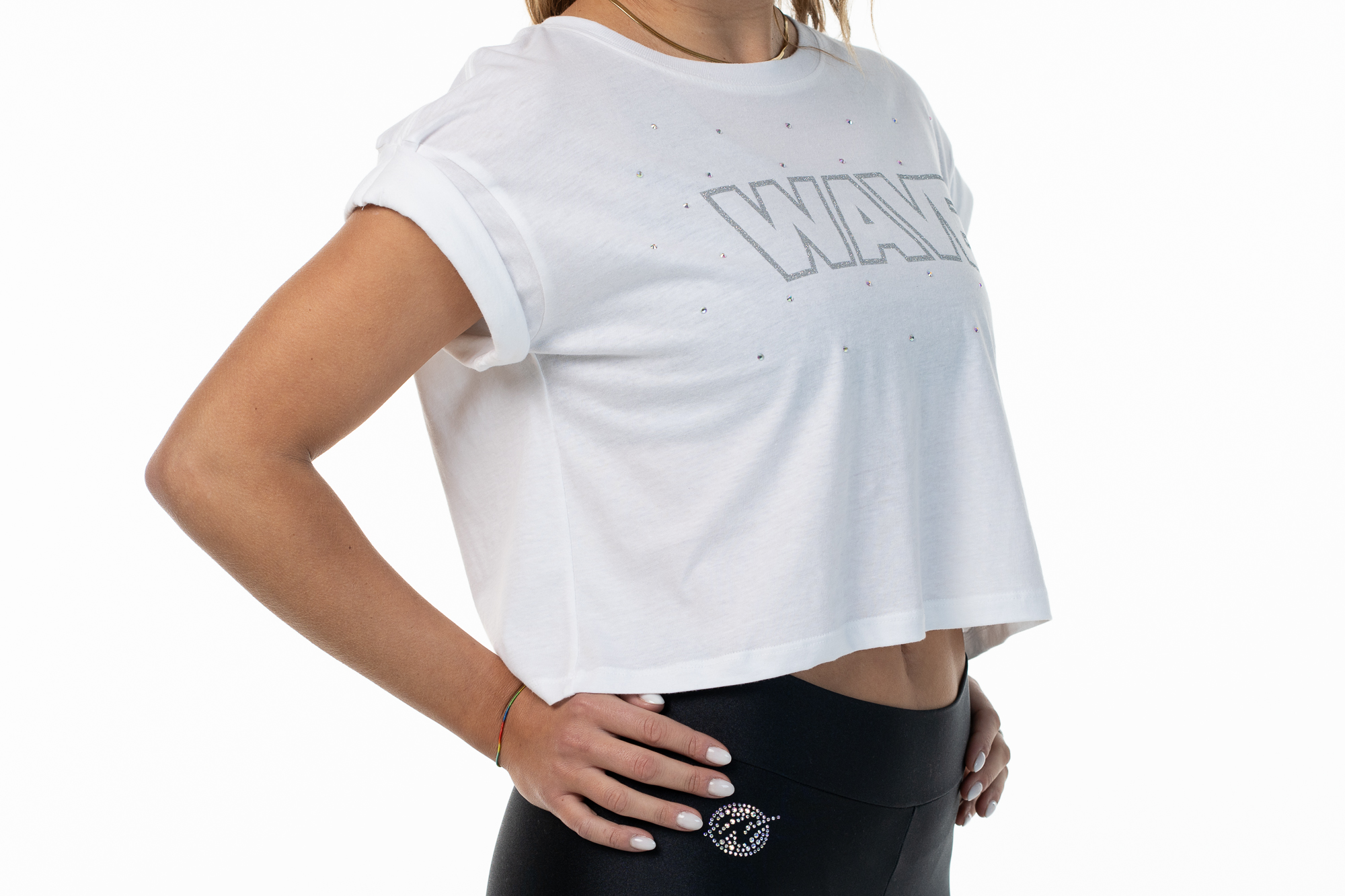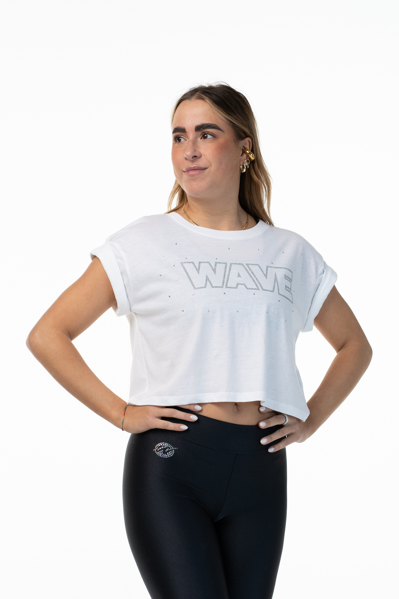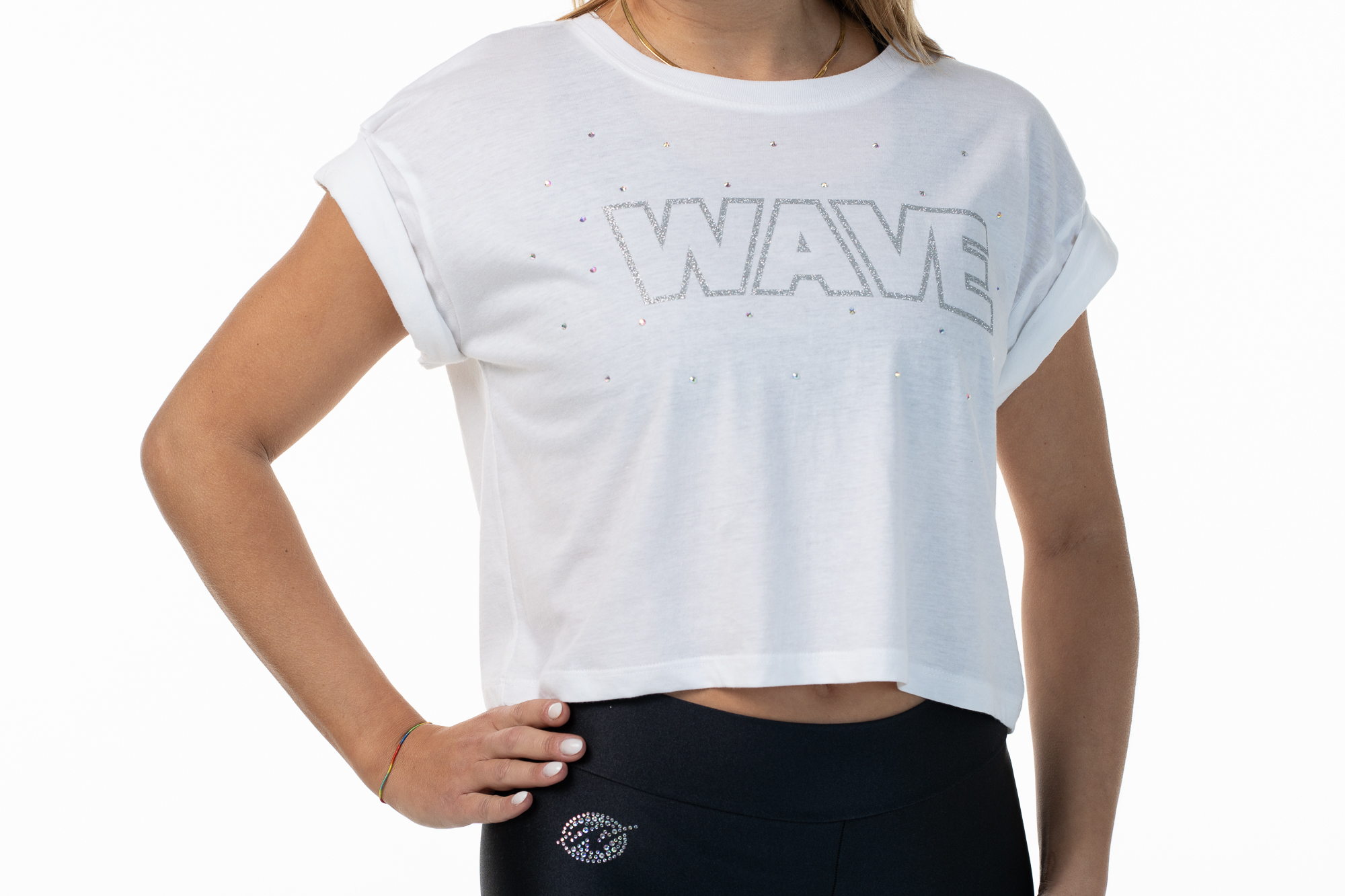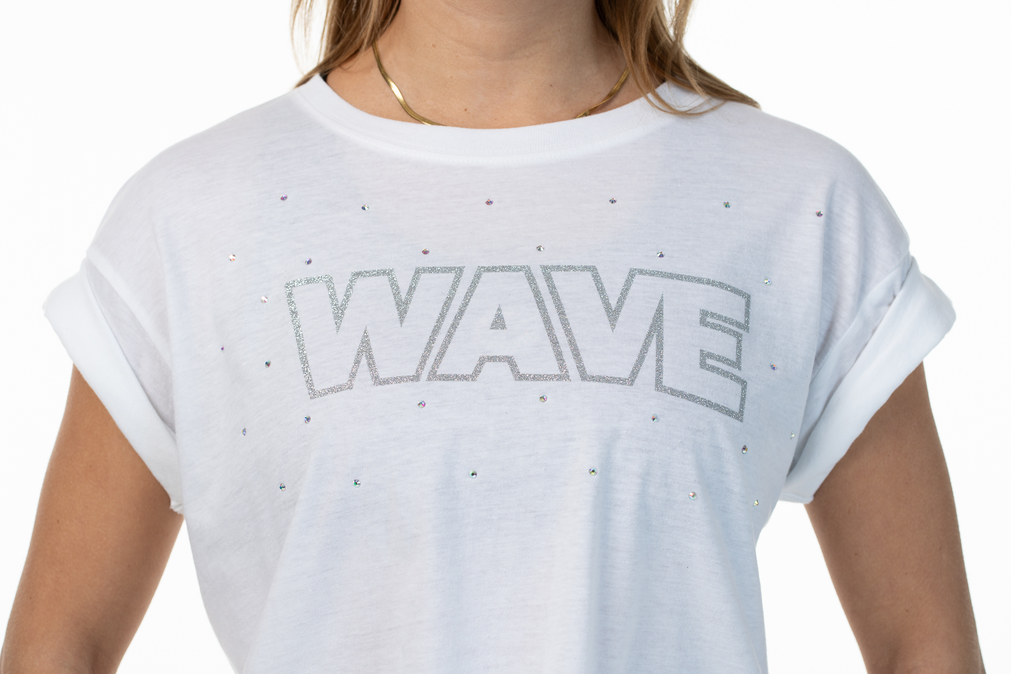 Add a touch of sparkle and style to your wardrobe with the Wave T-Shirt. Made from soft cotton, this crop top is perfect for those who love to combine comfort and fashion. The rolled sleeves design gives a casual-chic look, while the delicate Aurora Borealis rhinestones add a glamorous note that catches the light beautifully.